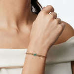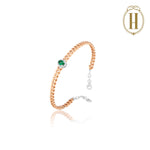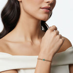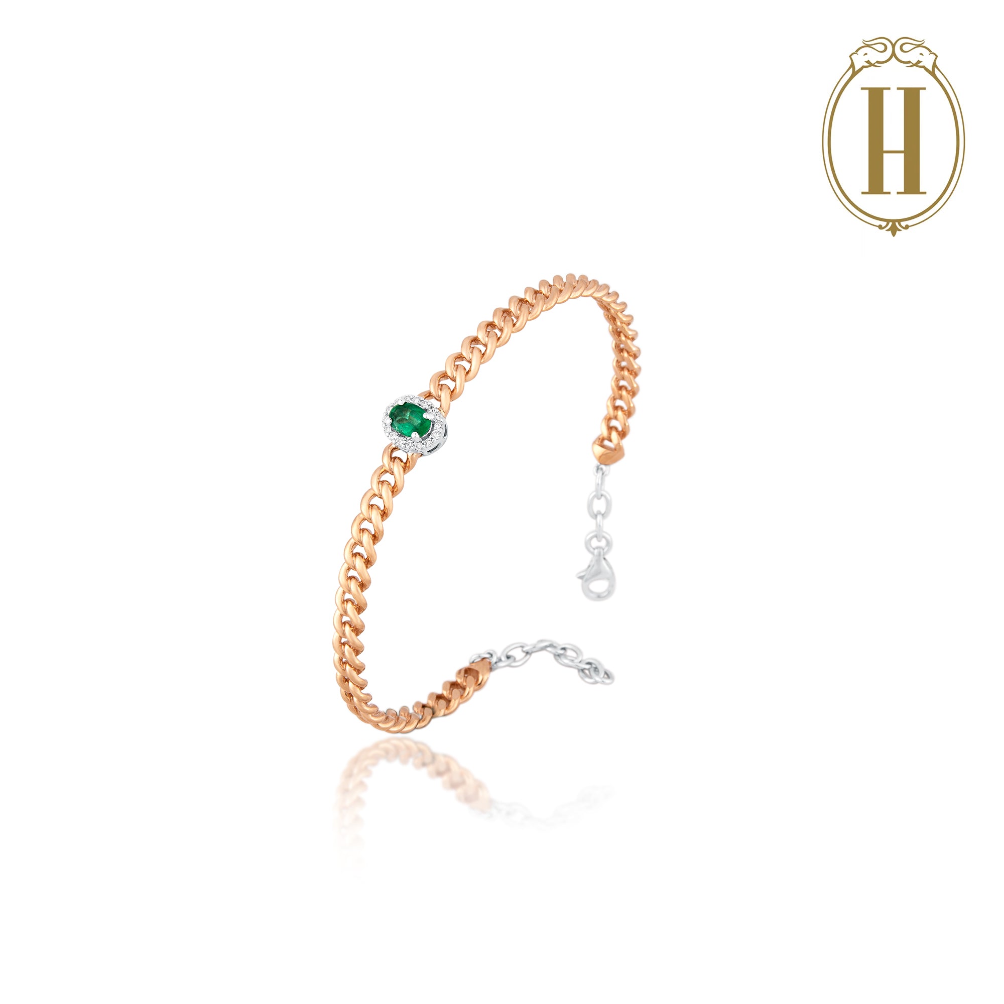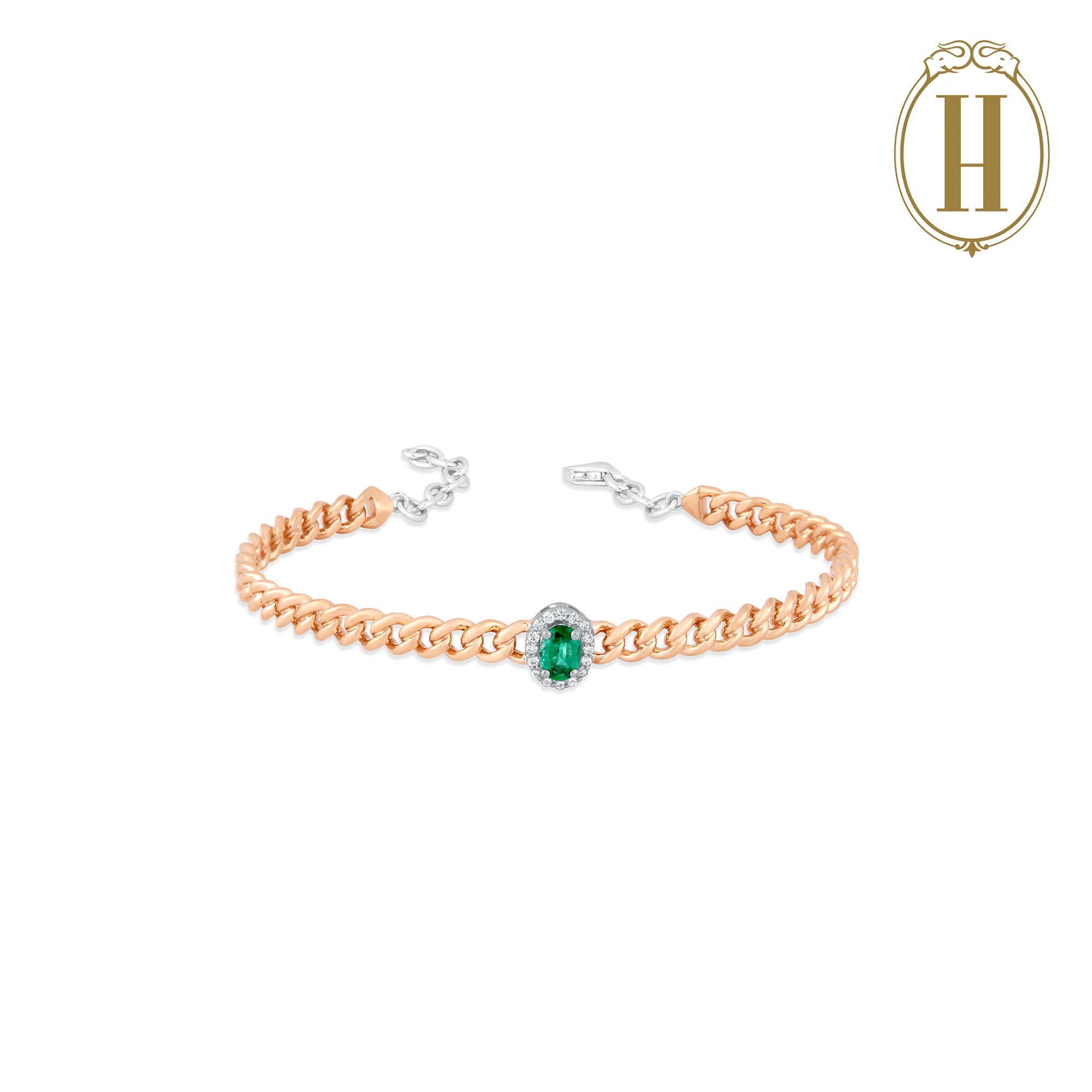 18 kt linked rose gold bracelet, featuring a vivid emerald centerpiece encircled by sparkling diamonds