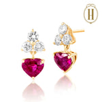 14 Kt yellow gold earrings set with round brilliant-cut diamonds and heart shaped ruby drops
