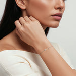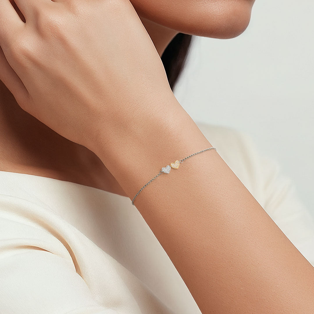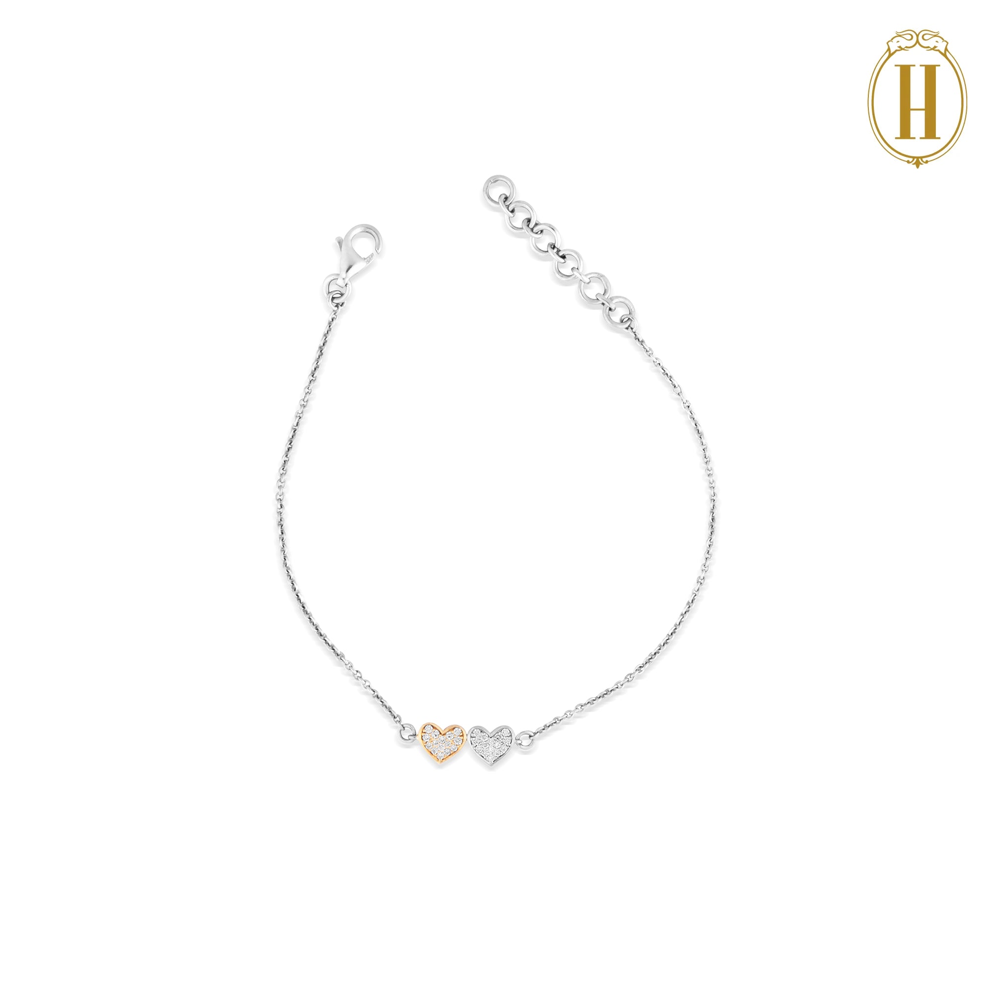 14KT white gold bracelet featuring two hearts of white gold and yellow gold encrusted with diamonds