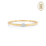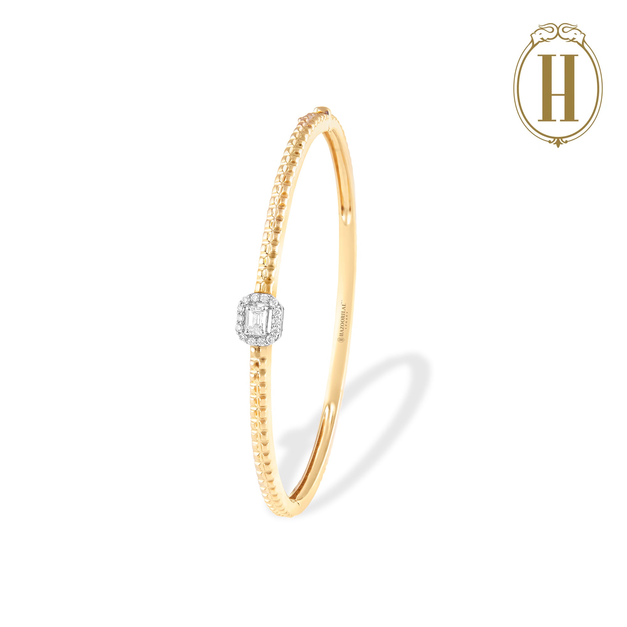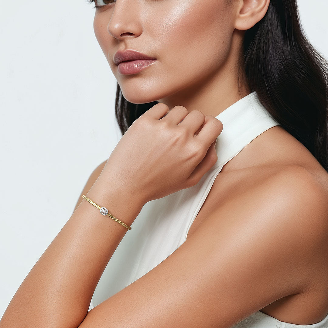 18 Kt yellow gold bracelet with an emerald-cut diamond in the center, surrounded by round brilliant-cut diamonds