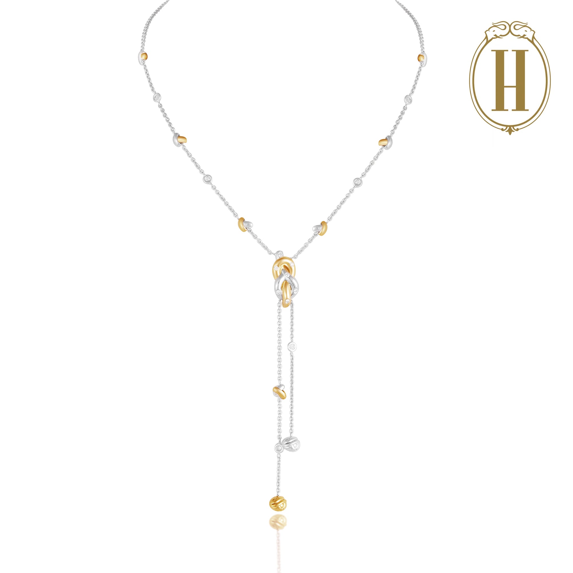 Elevate your style with this mixed metal lariat in yellow and white gold, featuring a knot design and a flowing, cascading drop with round brilliant-cut diamonds in a flush setting.