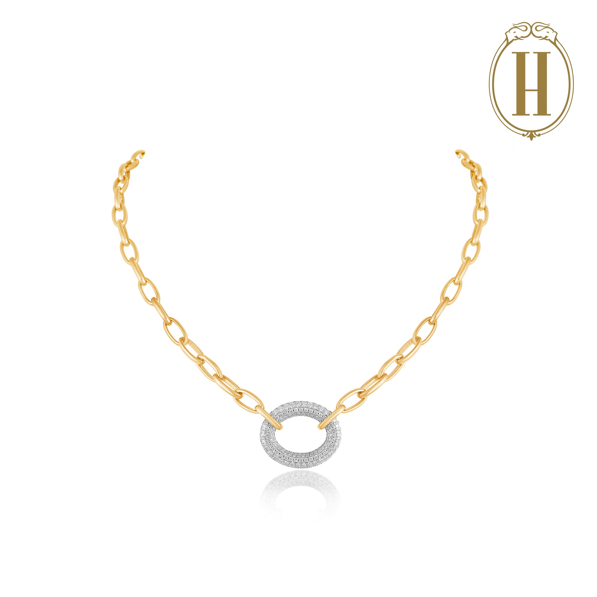 An 18 kt Yellow gold link necklace embellished with concentric circles of round brilliant-cut diamonds.