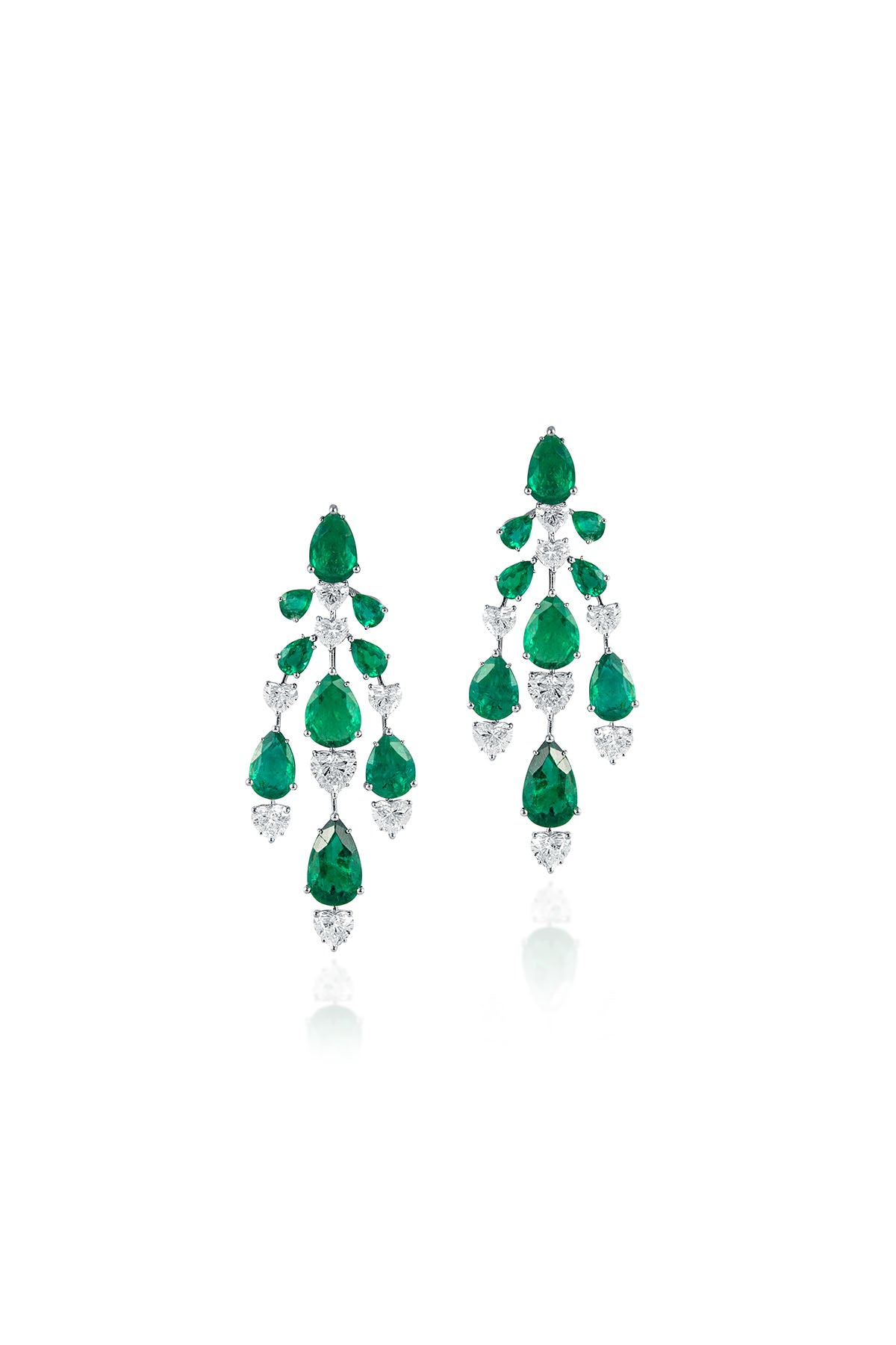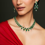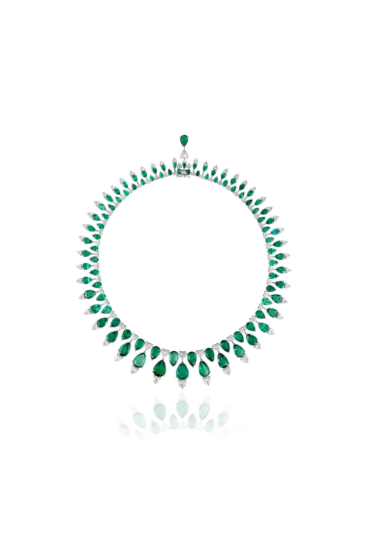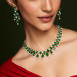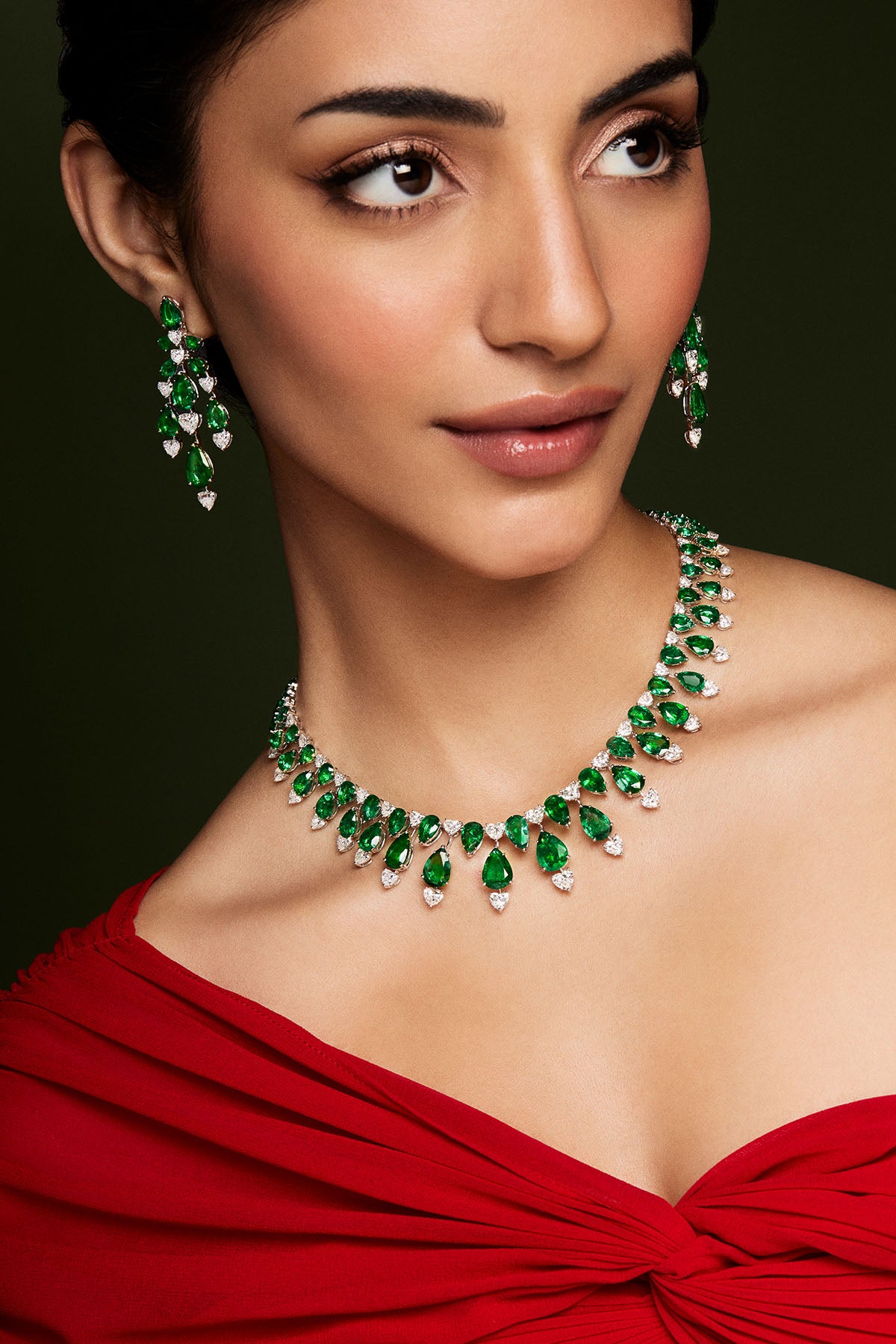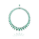 A contemporary twist on a timeless classic, The Legacy Collection embodies simplicity and elegance. This handcrafted emerald necklace set features meticulously selected pear shaped emeralds , complemented by sparkling heart shaped diamonds.