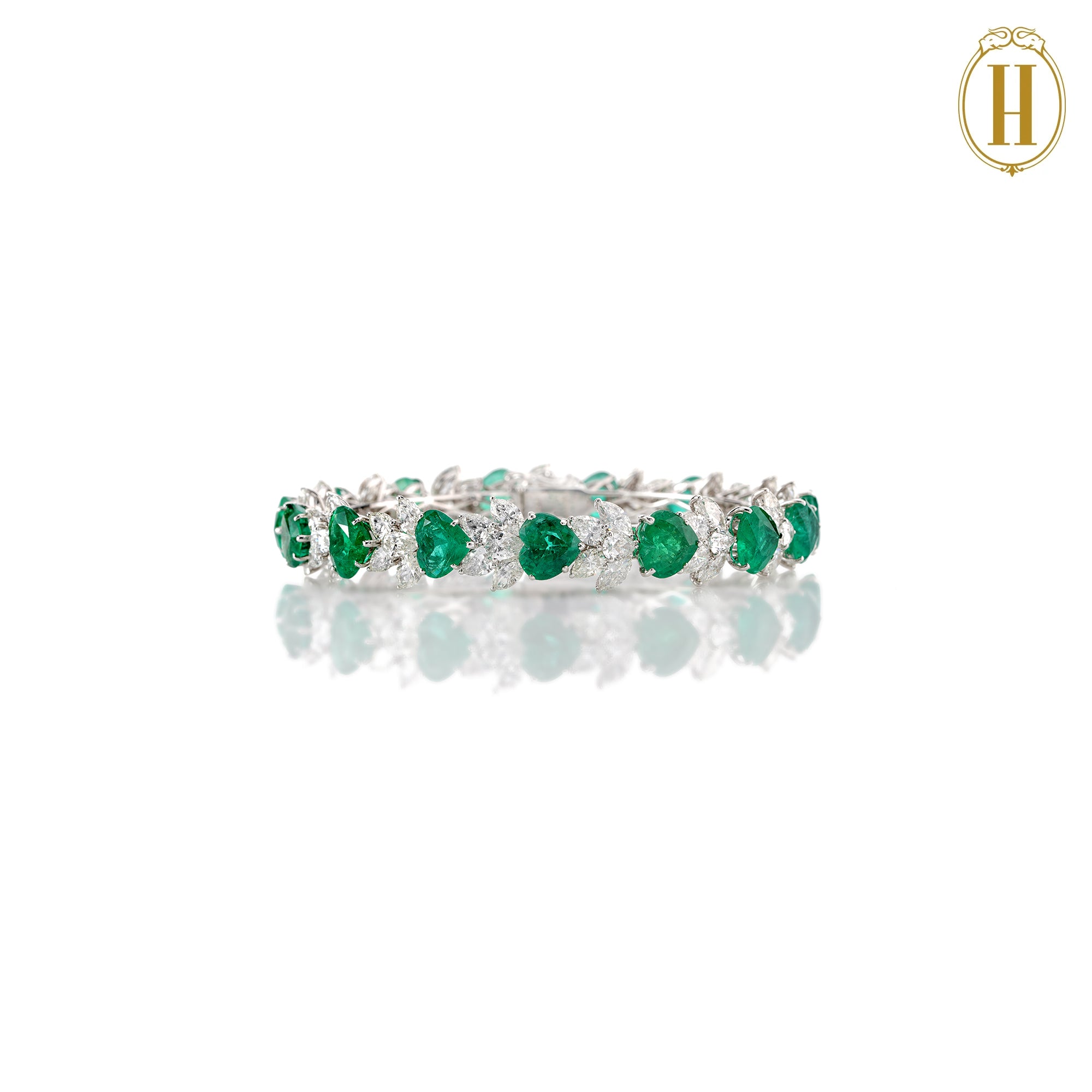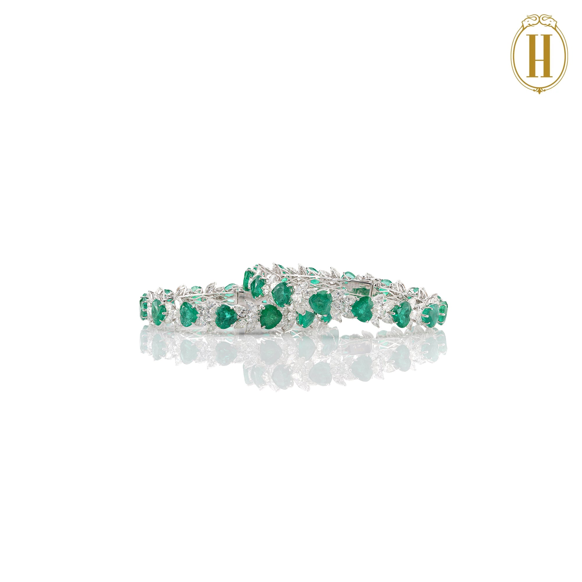 Bangles with GIA-certified fancy-shaped diamonds, complemented by high-quality, natural heart-shaped emeralds.