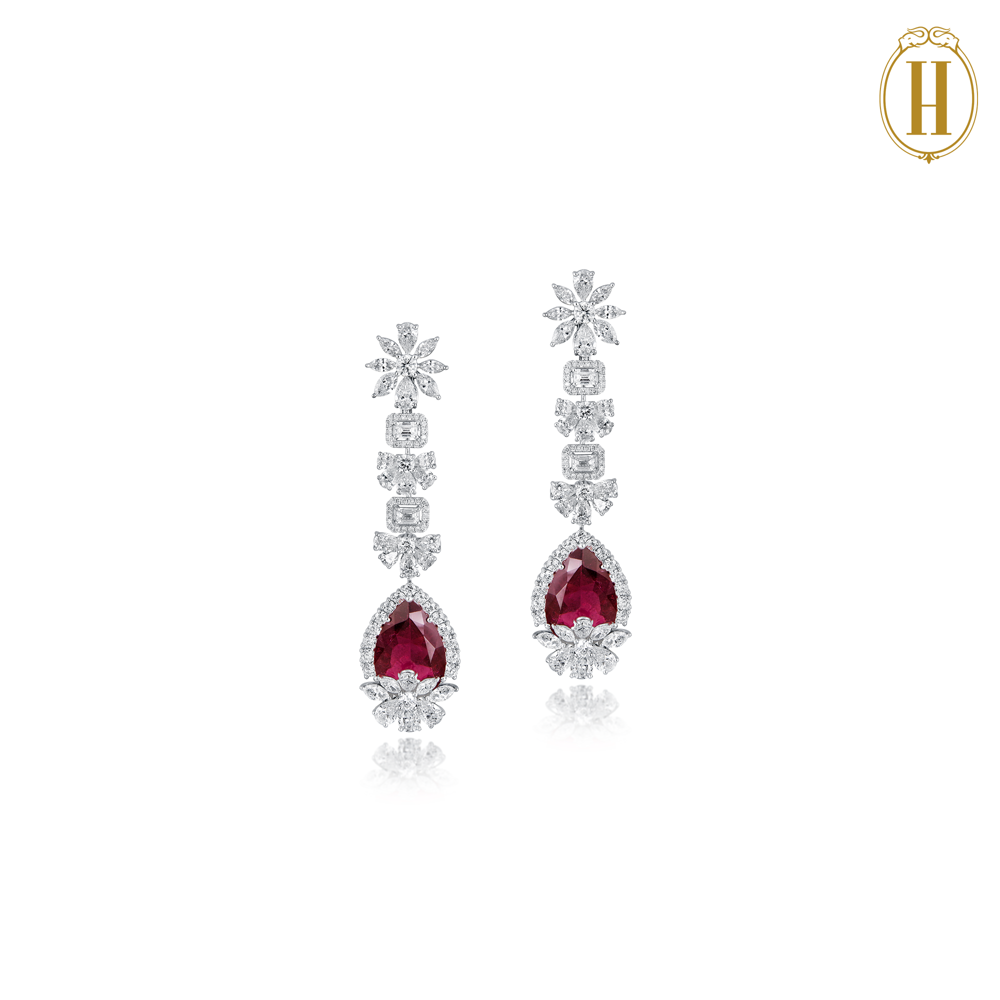 A floral arrangement of brilliant-cut and step-cut diamonds, accentuated by pear-cut red tourmaline drops, accompanied by a matching pair of earrings.