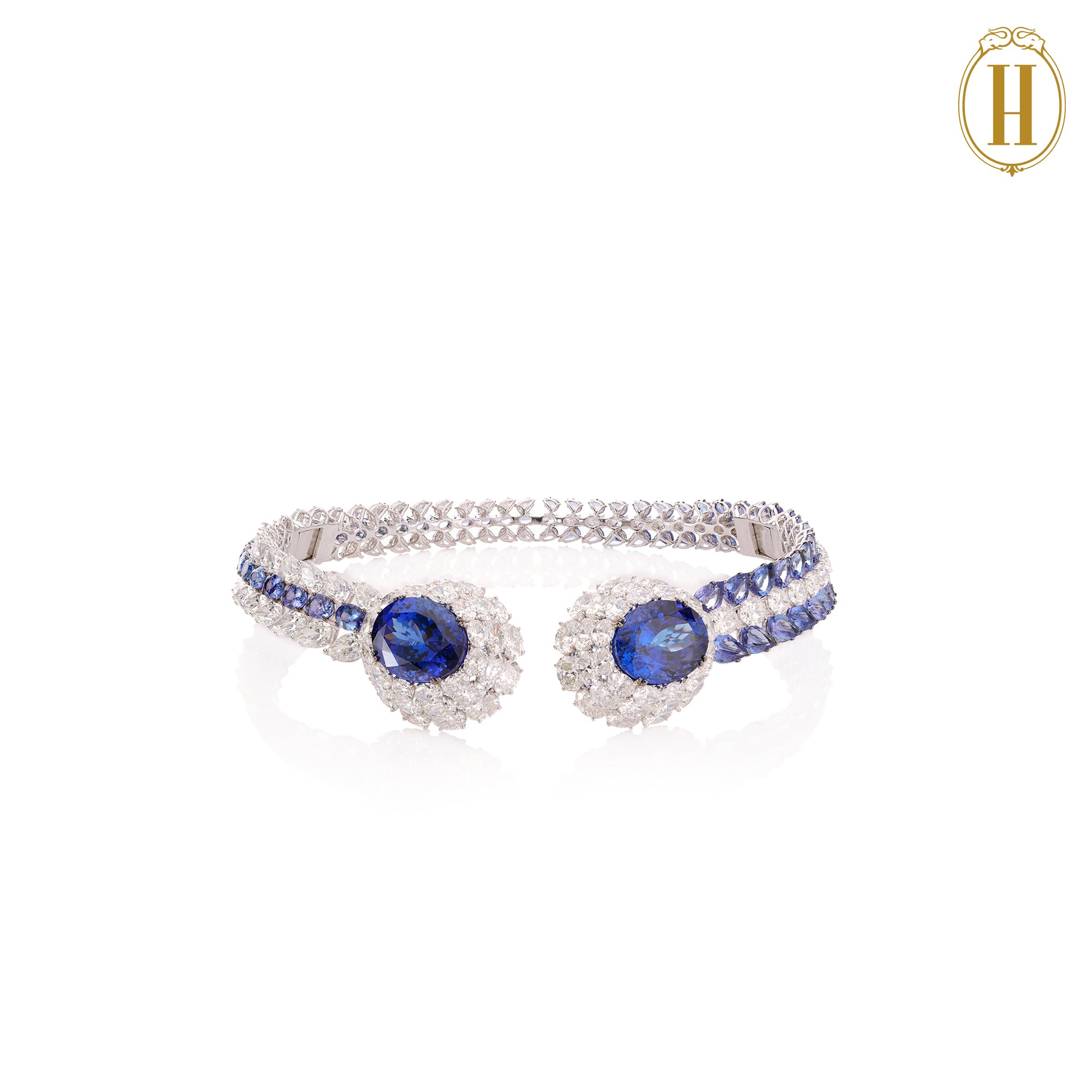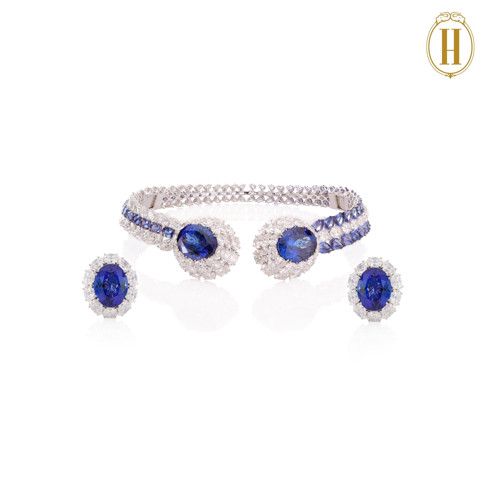 A choker set showcasing two large oval-shaped natural tanzanites, accompanied by GIA-certified solitaires and natural tanzanites in pear and oval shapes.