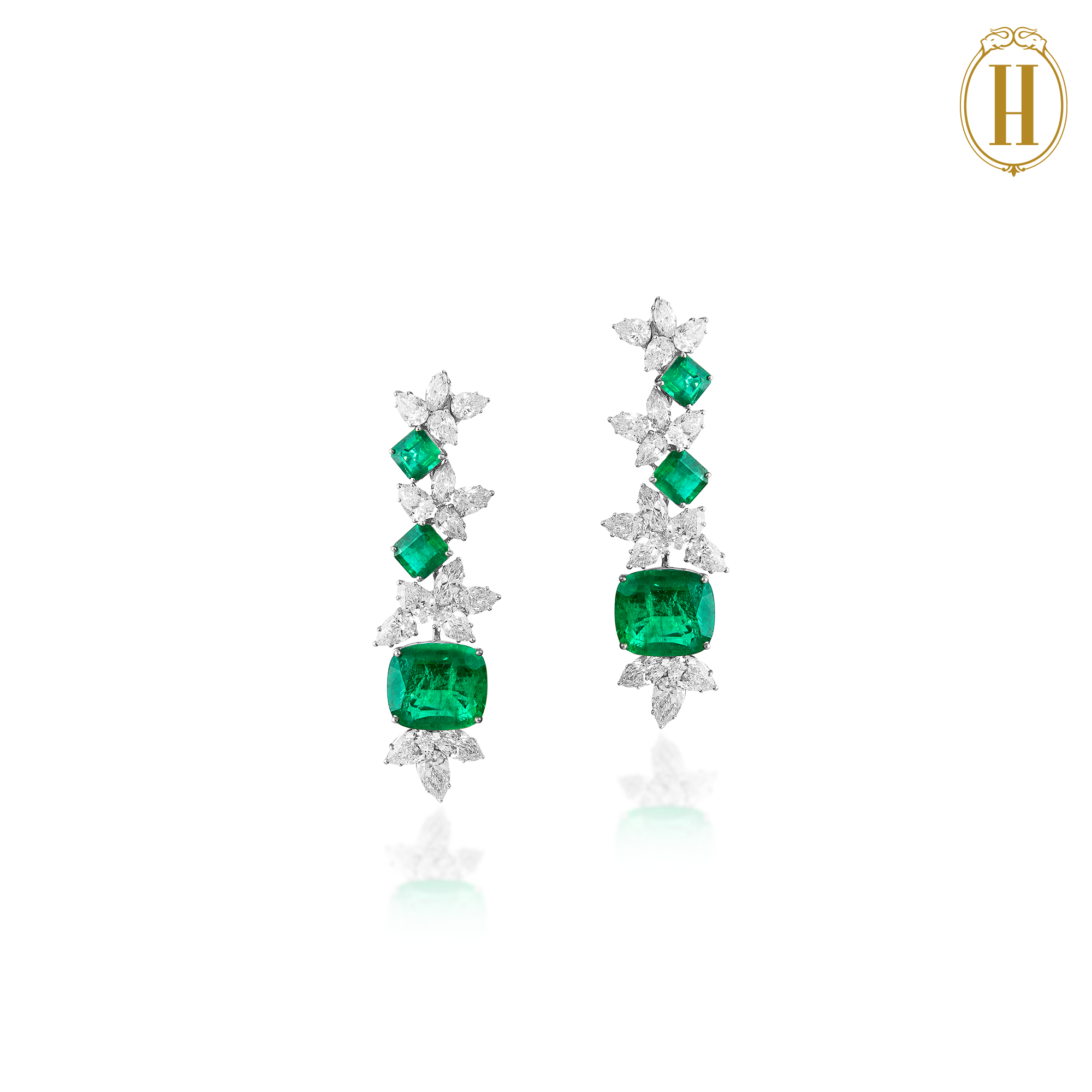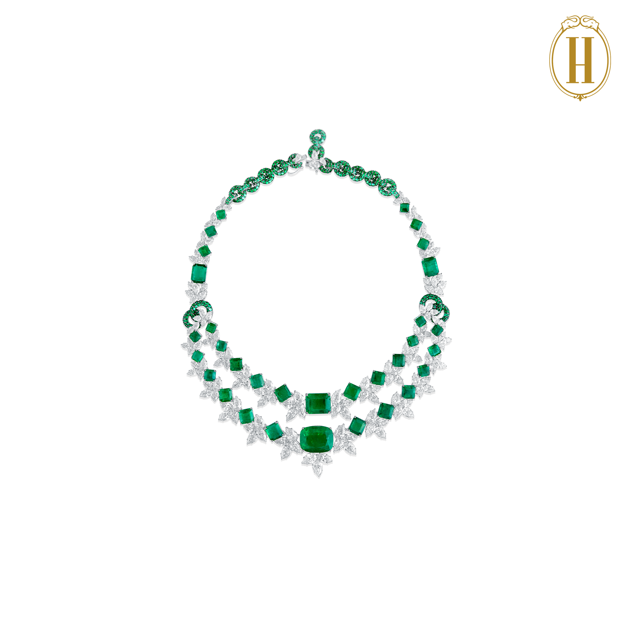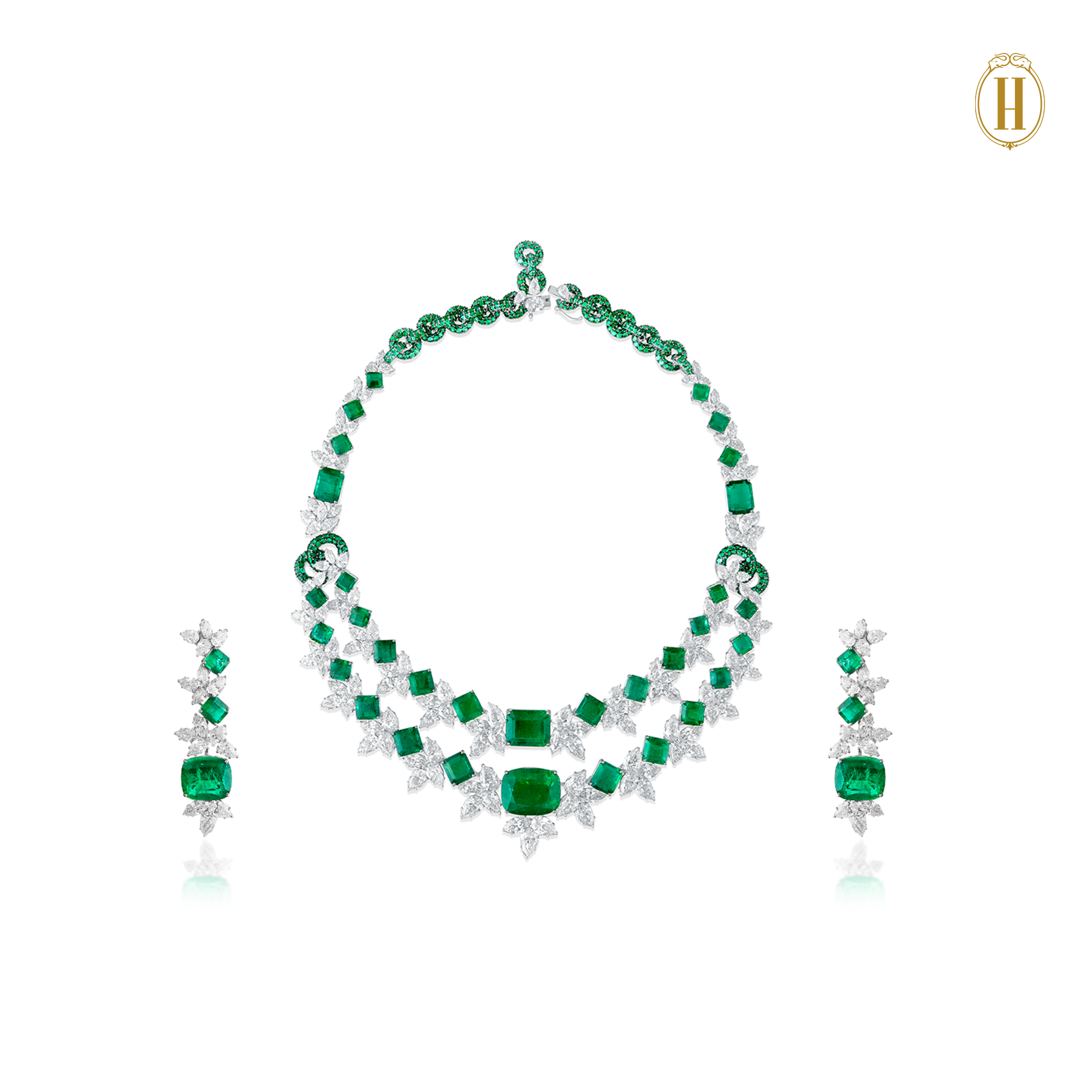 A double-layered contemporary necklace evocative of grace and modern femininity, studded with marquise-cut diamonds and Colombian emeralds, accompanied by a matching pair of earrings.