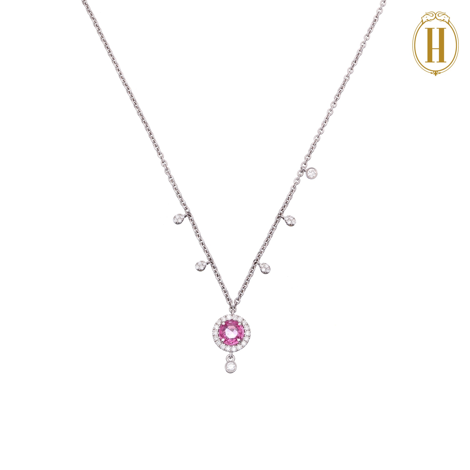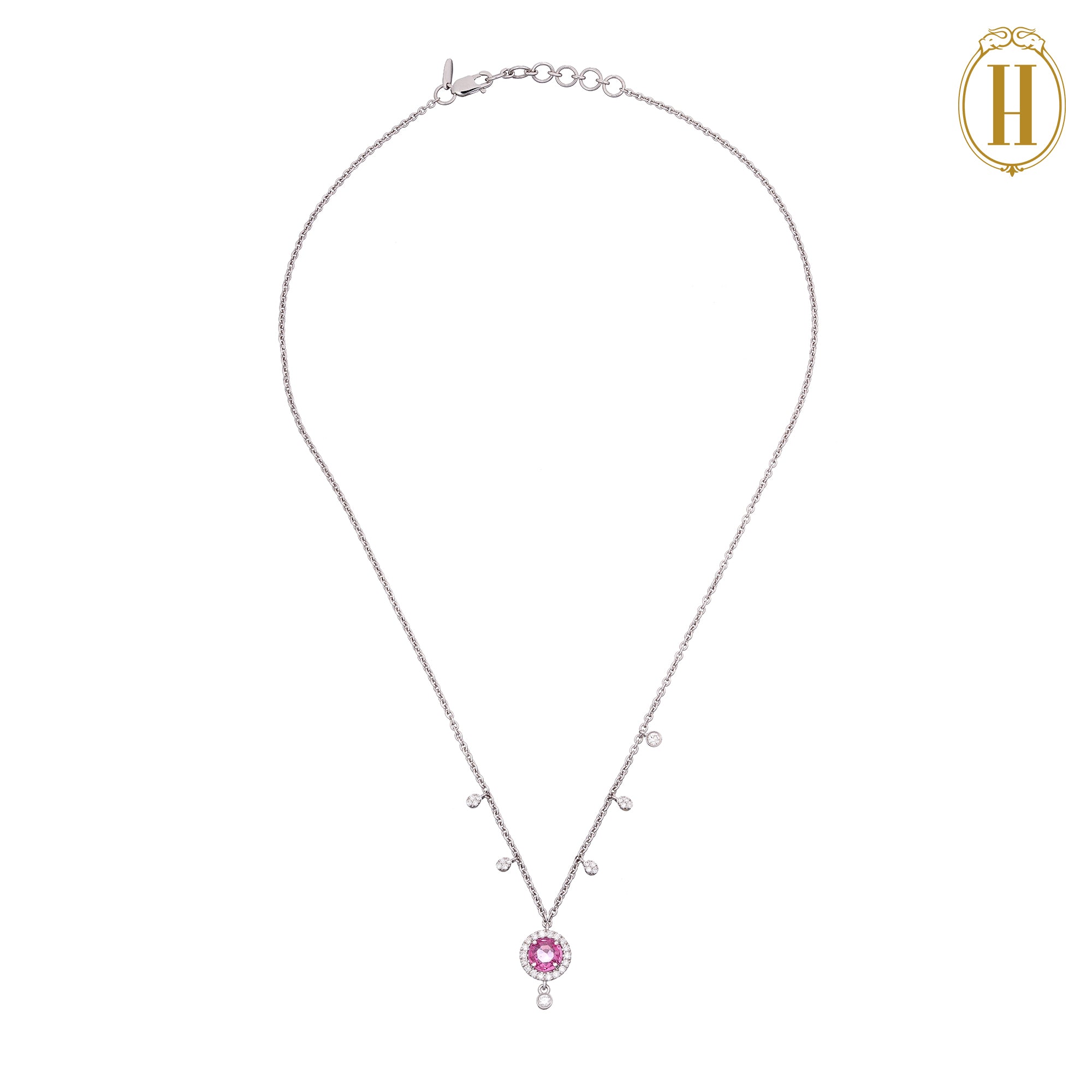 14KT white gold necklace with round brilliant-cut diamonds encrusted with a pink sapphire.