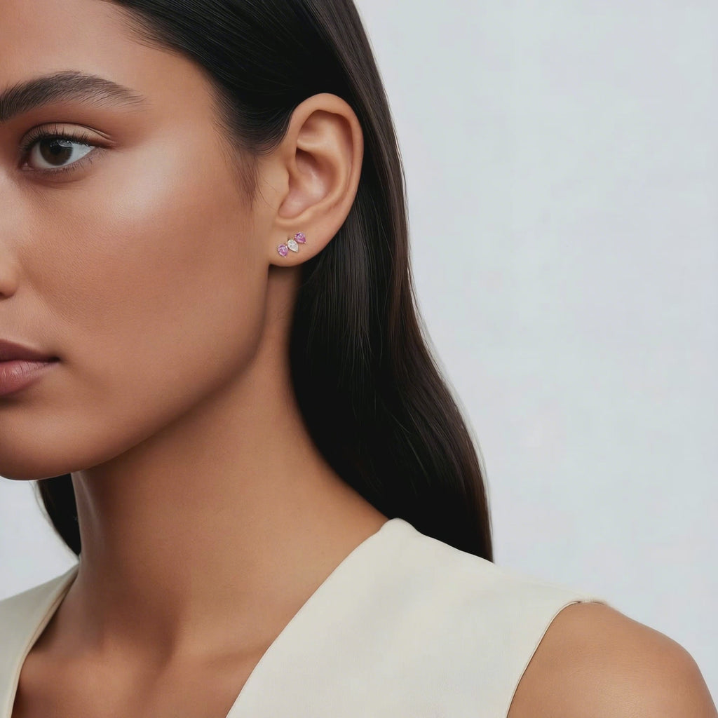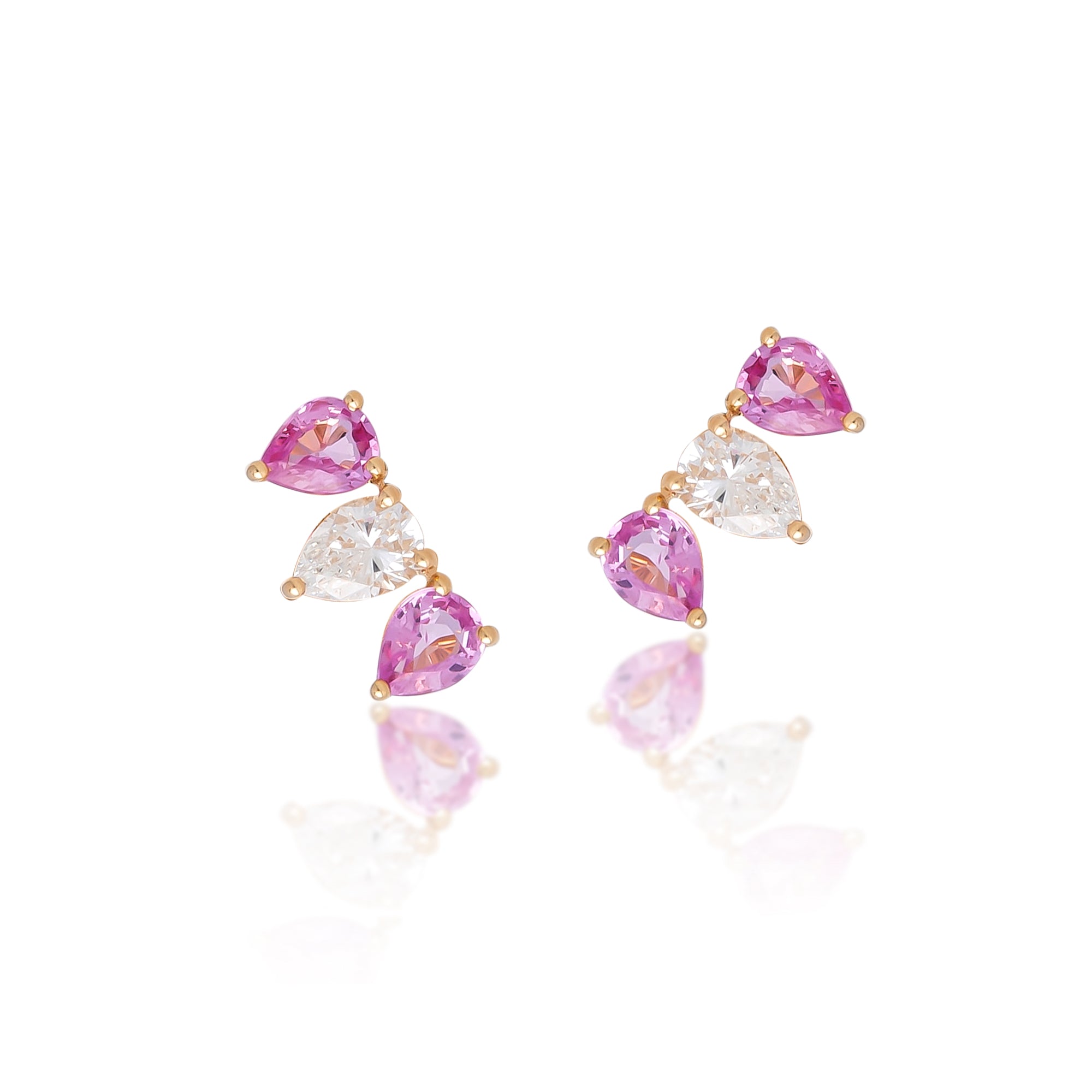 Crown-shaped earrings adorned with pear shaped diamonds and pink sapphires.