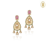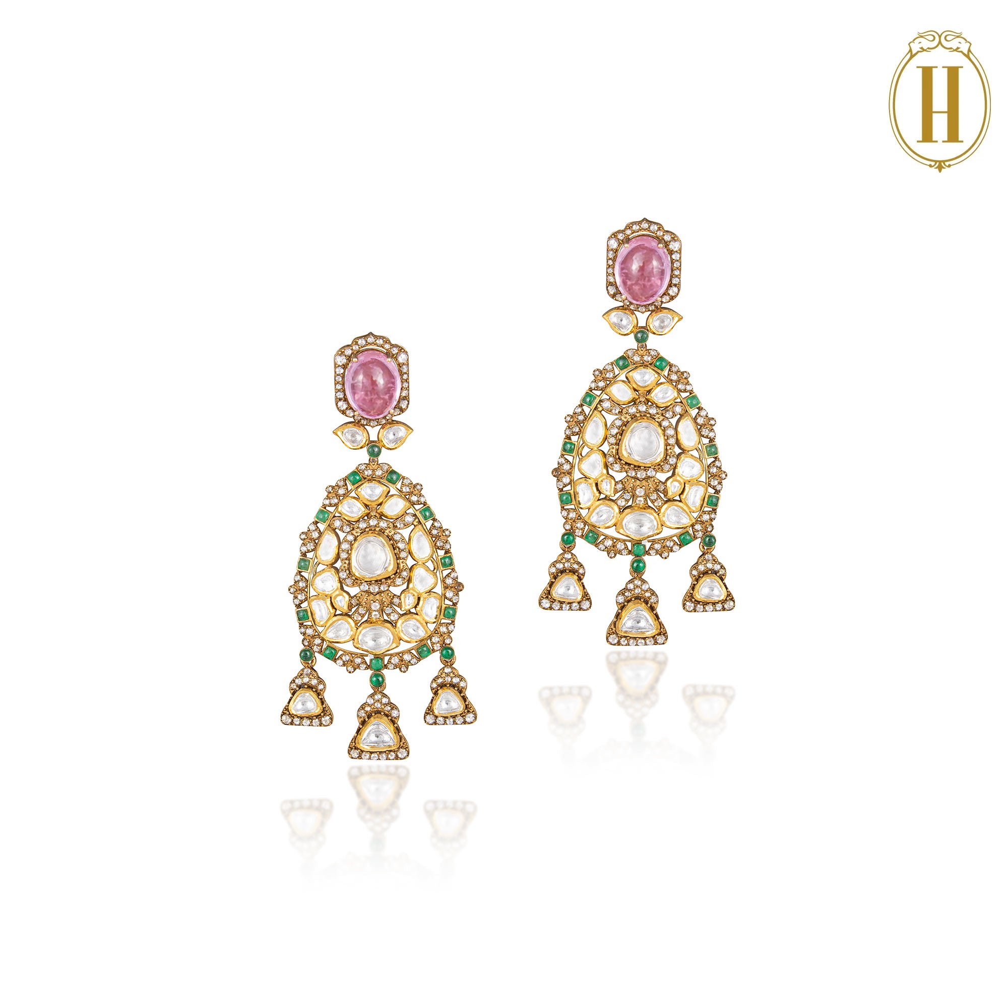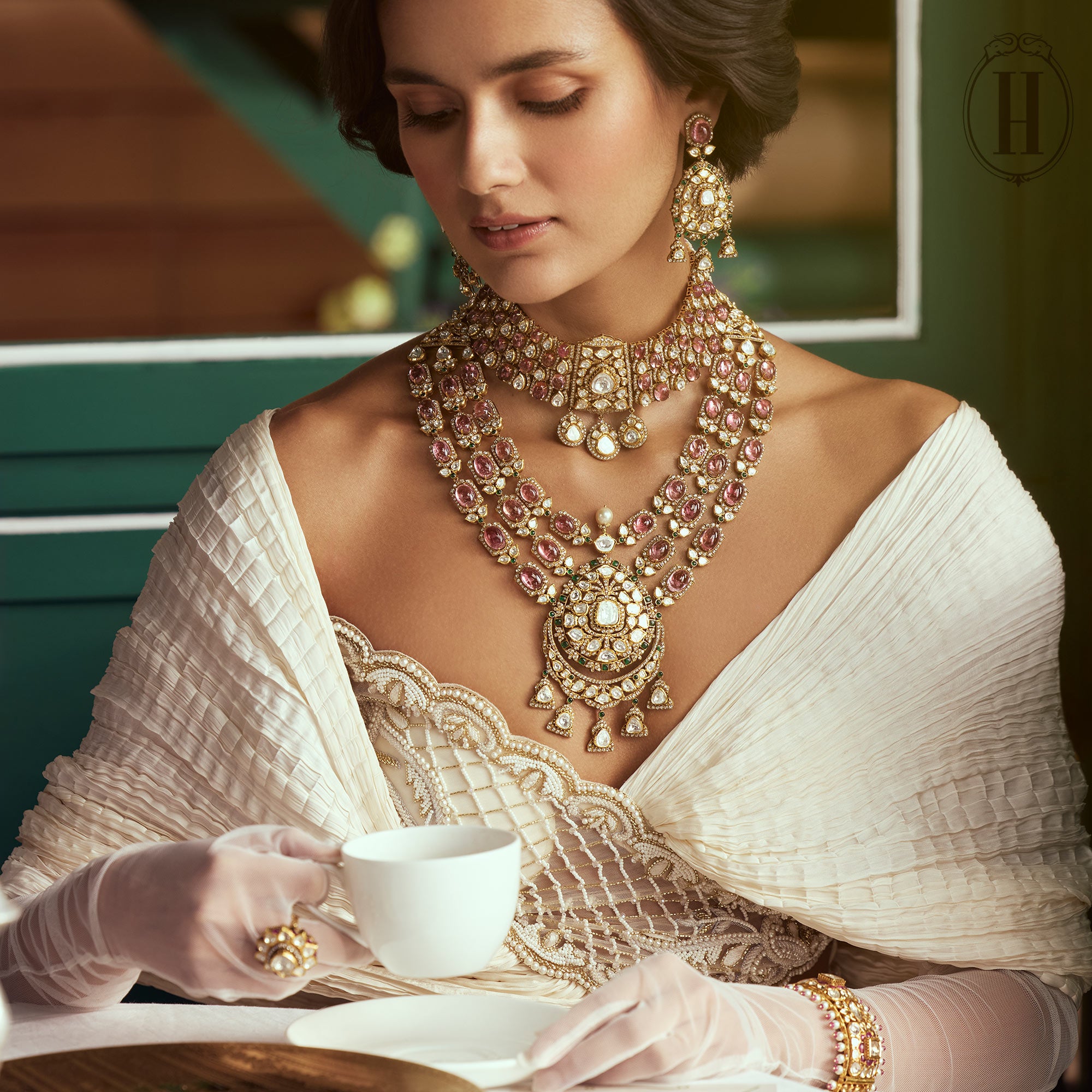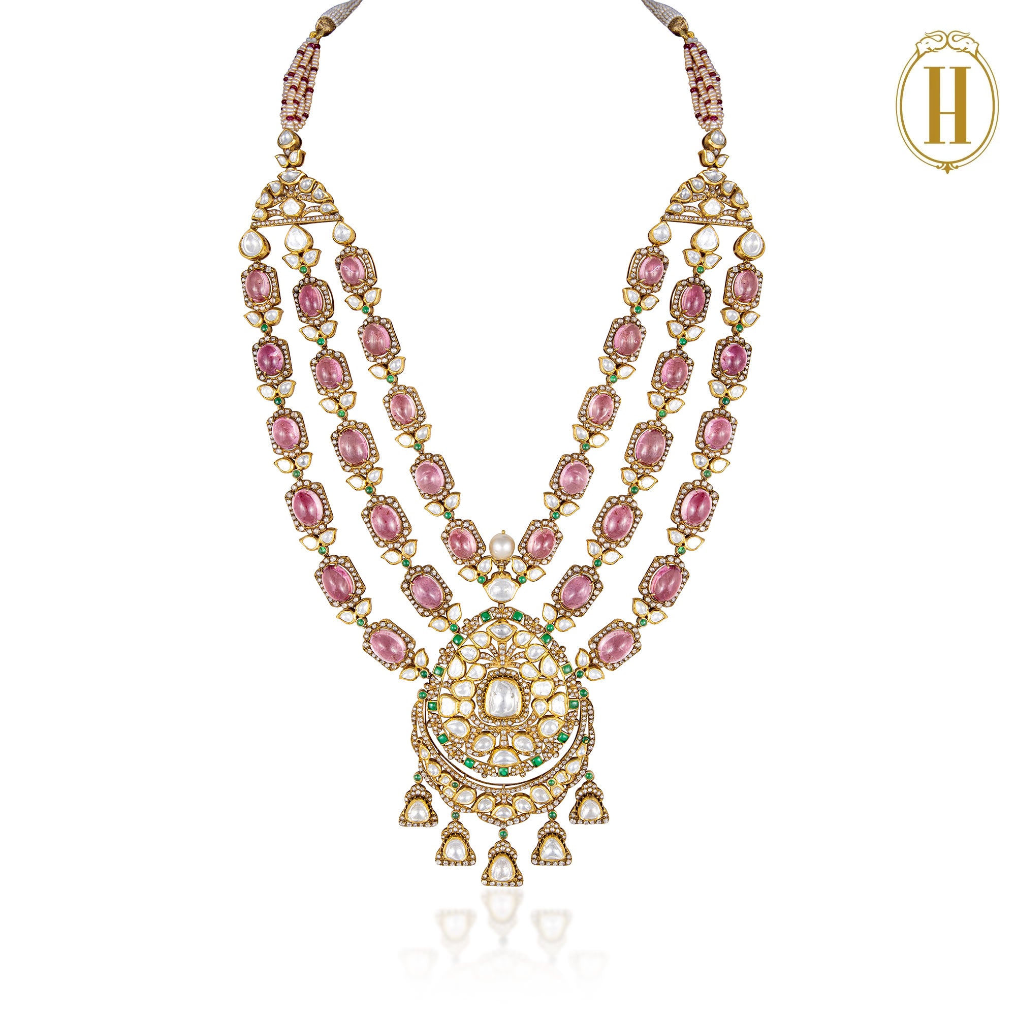 Old-world charm meets modern-day luxury —this exquisite two-layered polki necklace set features a stunning cascade of pink tourmalines paired with emeralds and a mélange of uncut and full-cut diamonds.