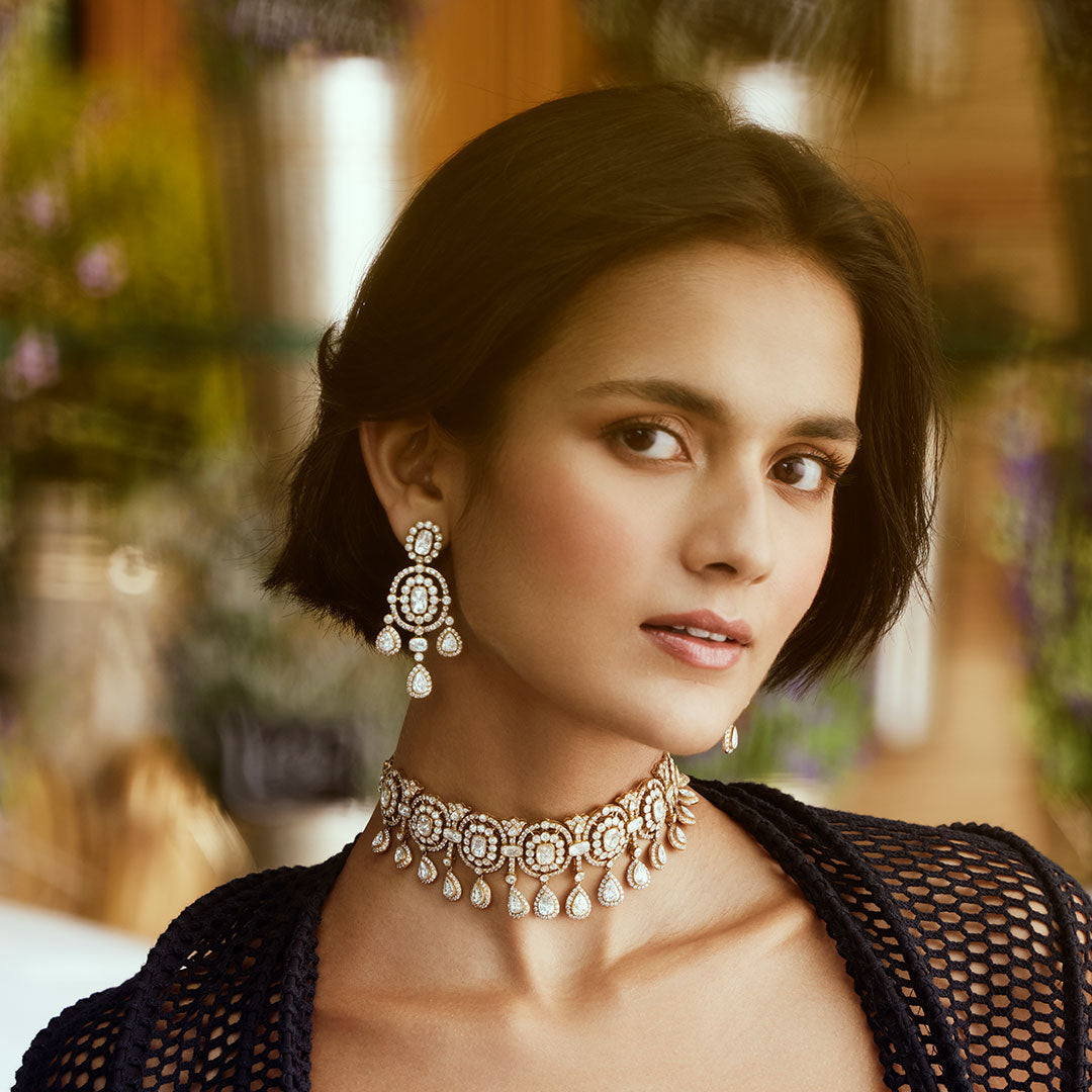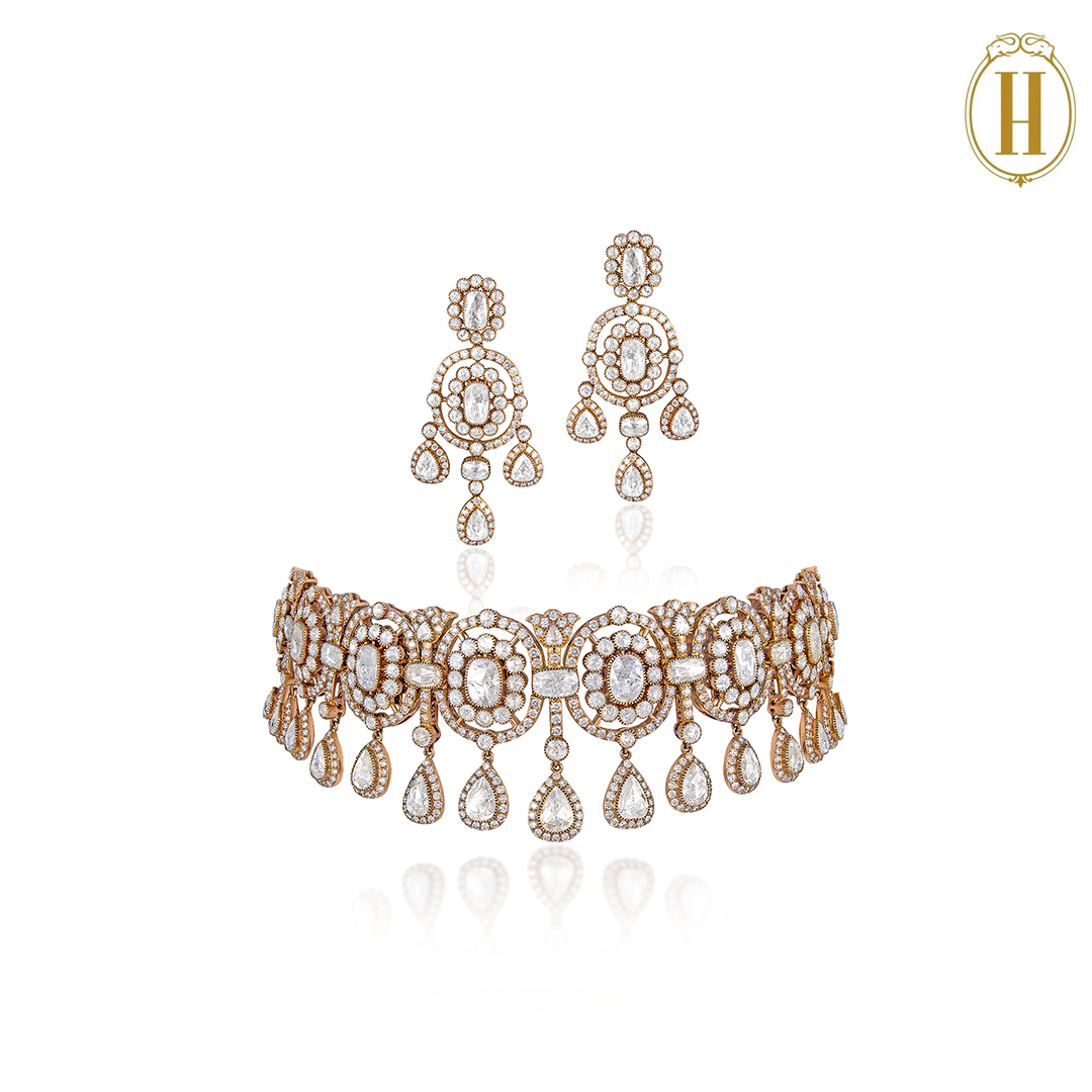 A traditional and timeless design recreated, set with old mine cut and rose cut diamonds set delicately in 18KT yellow gold.