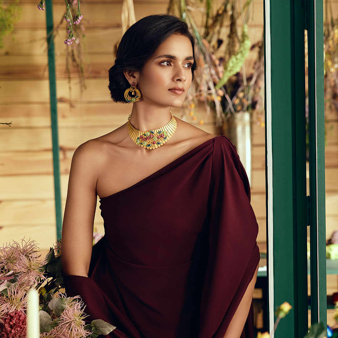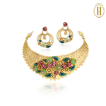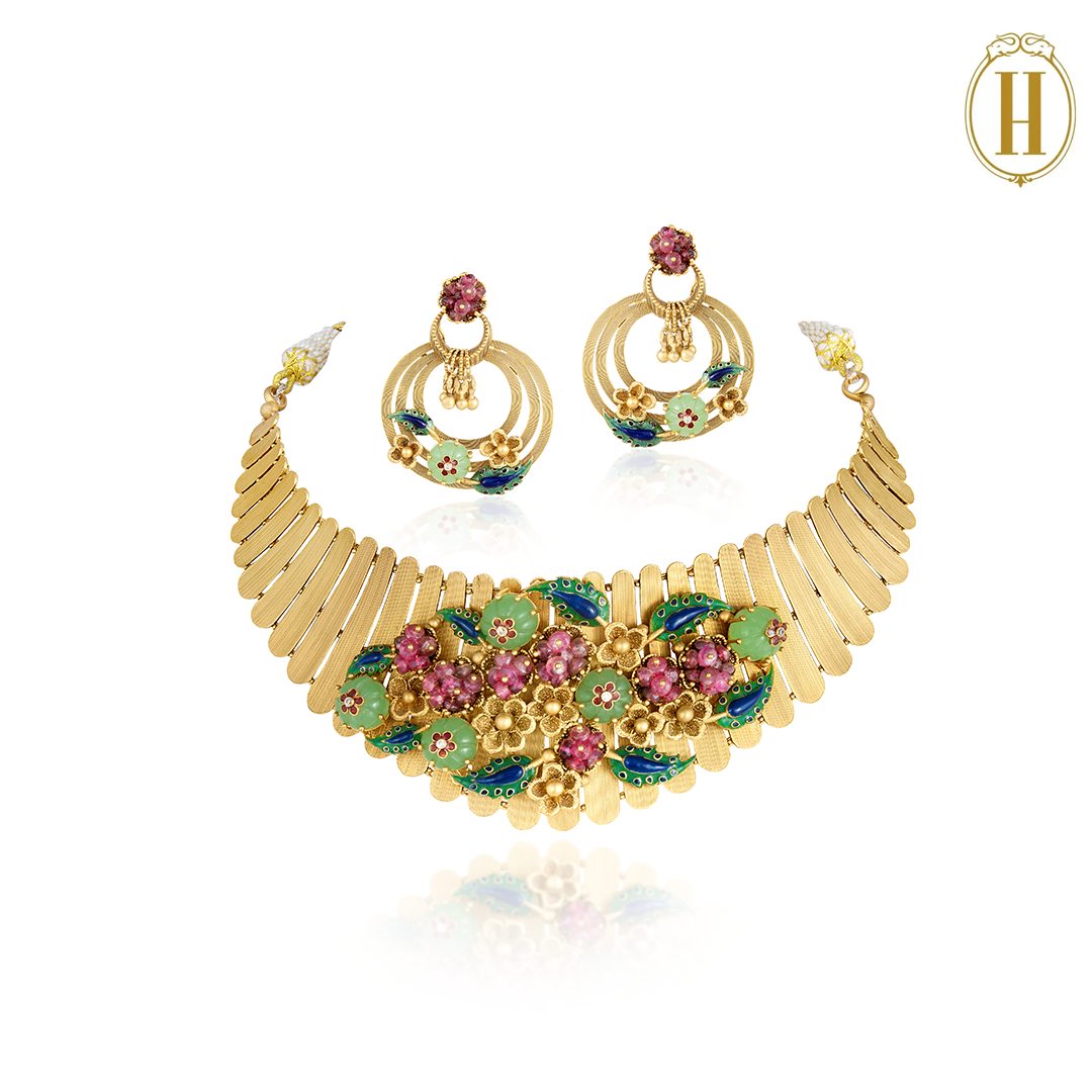 This contemporary gold choker features floral accents composed of pastel-hued emeralds and vivid rubies, set on a matte gold finish and complemented by matching earrings.