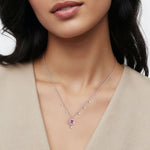 14KT white gold necklace with round brilliant-cut diamonds encrusted with a pink sapphire.