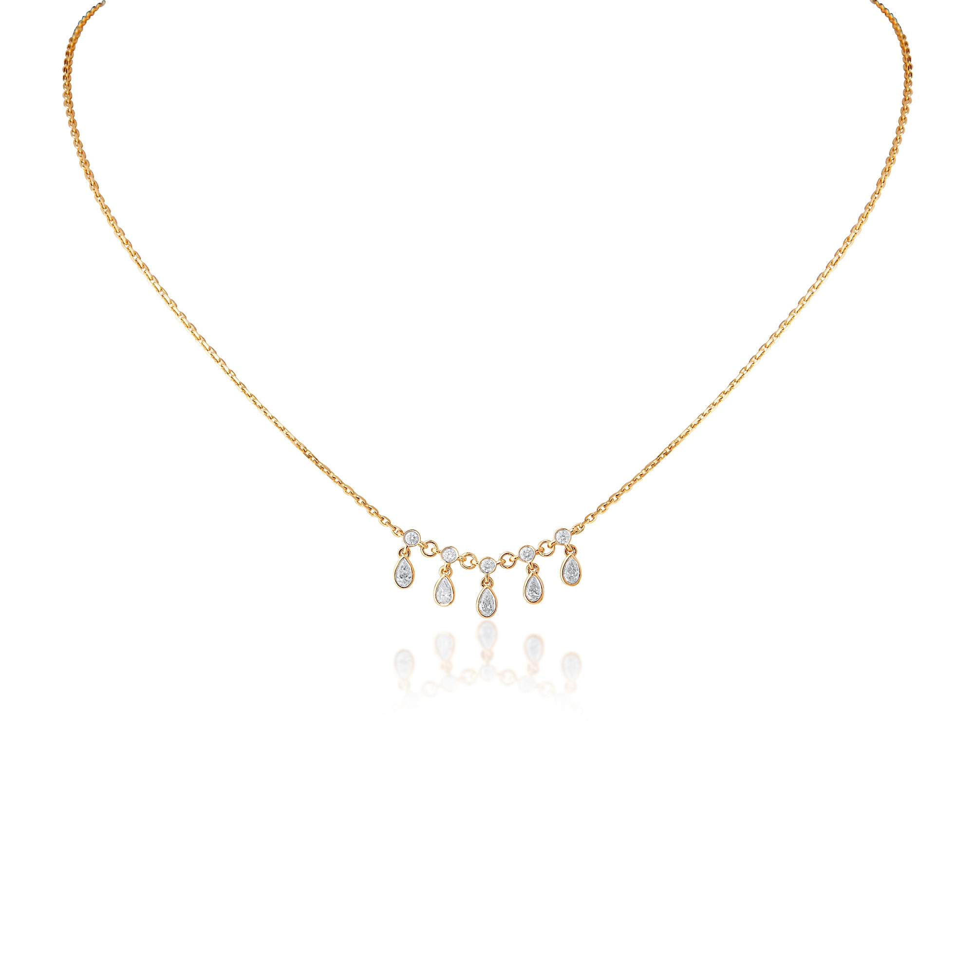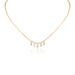 18 KT yellow gold necklace with round brilliant cut diamonds and pear shape diamonds drops.