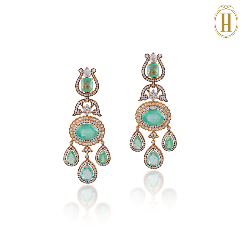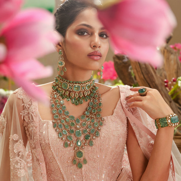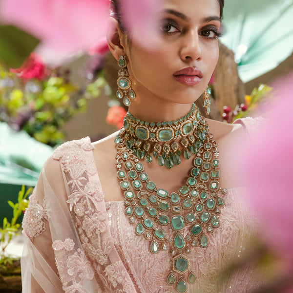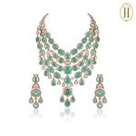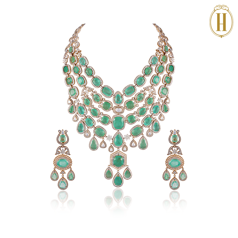 The alluring extravagance of emeralds bestrewn with uncut and round brilliant diamonds coalesce to form a lavish luxury of layers.